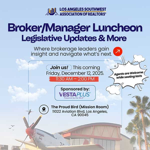 Join us at the Proud Bird for an informative luncheon designed to help brokerage leaders stay ahead of legislative changes, industry updates, and strategic insights that impact our real estate community. This gathering offers valuable learning and networking opportunities for brokers, managers, and leaders across the industry.